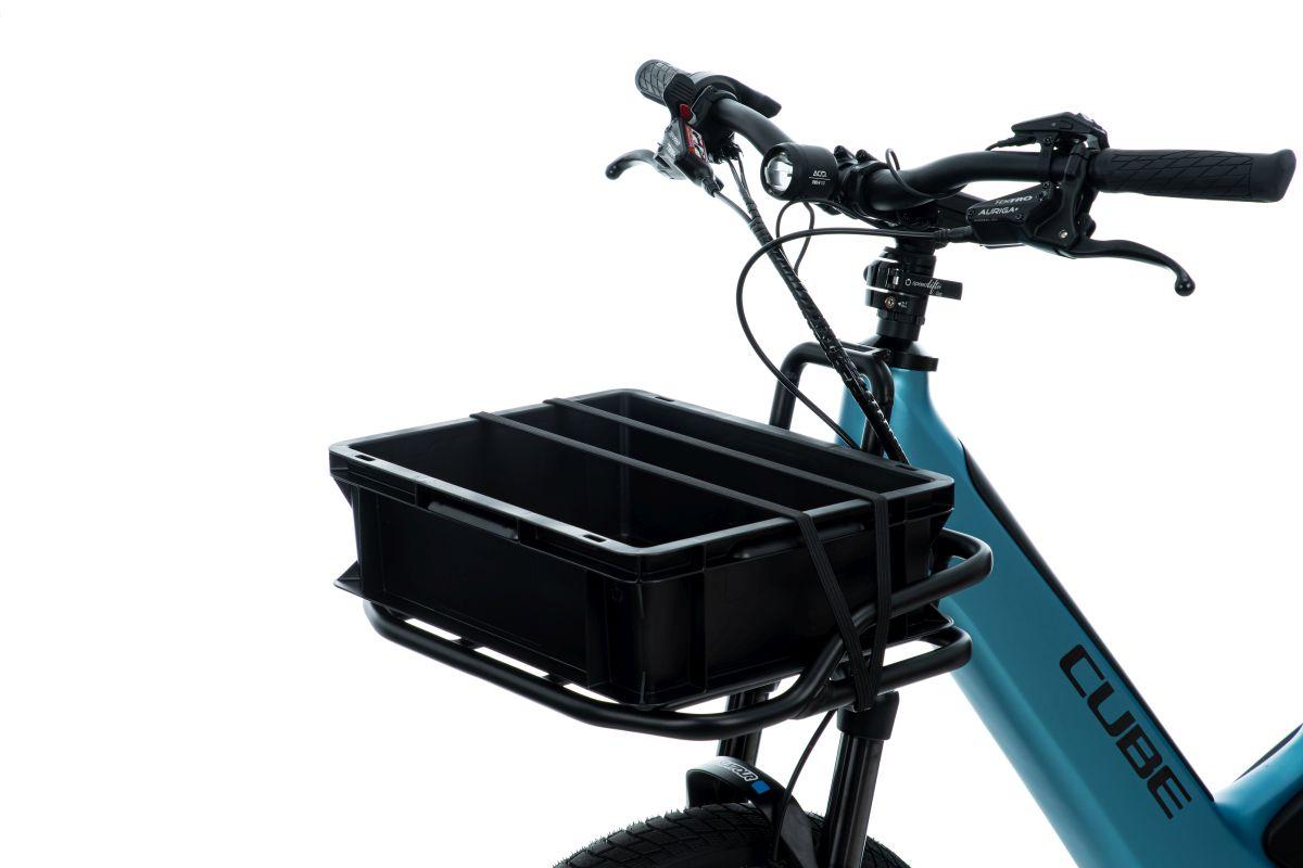passend für CUBE Trike Hybrid, Longtail Hybrid, Editor Hybrid, Ladefläche passend für 300 mm x 400 mm Eurobox, kompatibel mit ACID Gepäckträgerkorb RILink (20L oder 25L), verschraube individuelle Behälter oder Platten mit der Tragfläche, befestige Gepäck mit Spanngurten, innovative Befestigung am Rad, HIC - Headtube Integrated Carrier