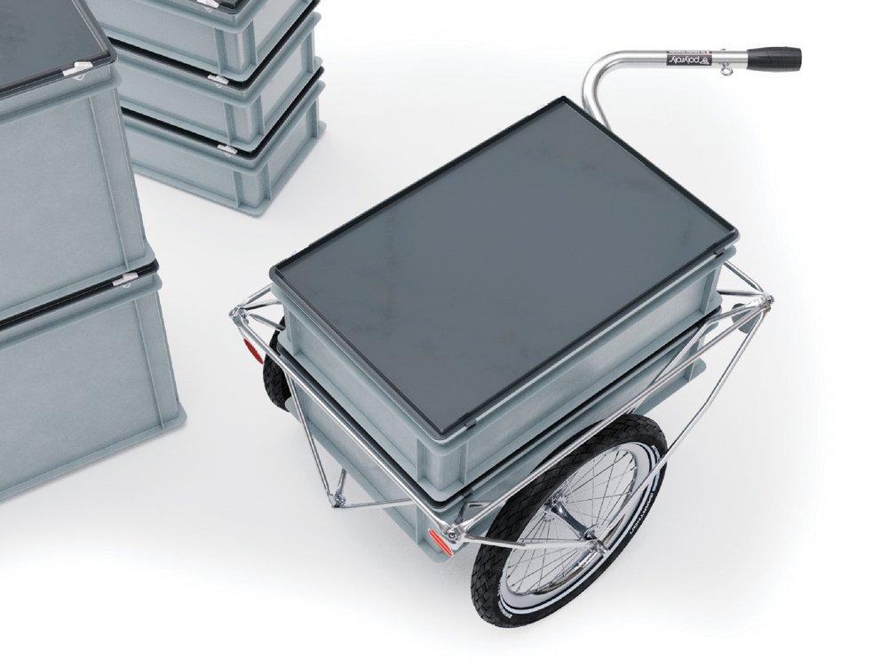 Der BOX 1.0 ist der kleinste BOX-polyroly. Er bietet Platz für einen Normbehälter im Format 60 × 40 cm und wiegt rund 6,7 kg – damit gehört er zu den leichtesten Cargoanhängern überhaupt. Der BOX 1.0 wird je nach Transportaufgabe individuell mit einem Behälter, einer Kiste oder einem Korb aus dem Brockenhaus ausgestattet. Auch kleine Behälter lassen sich sicher im Spaceframe transportieren, eine Bodenplatte wird nicht benötigt.