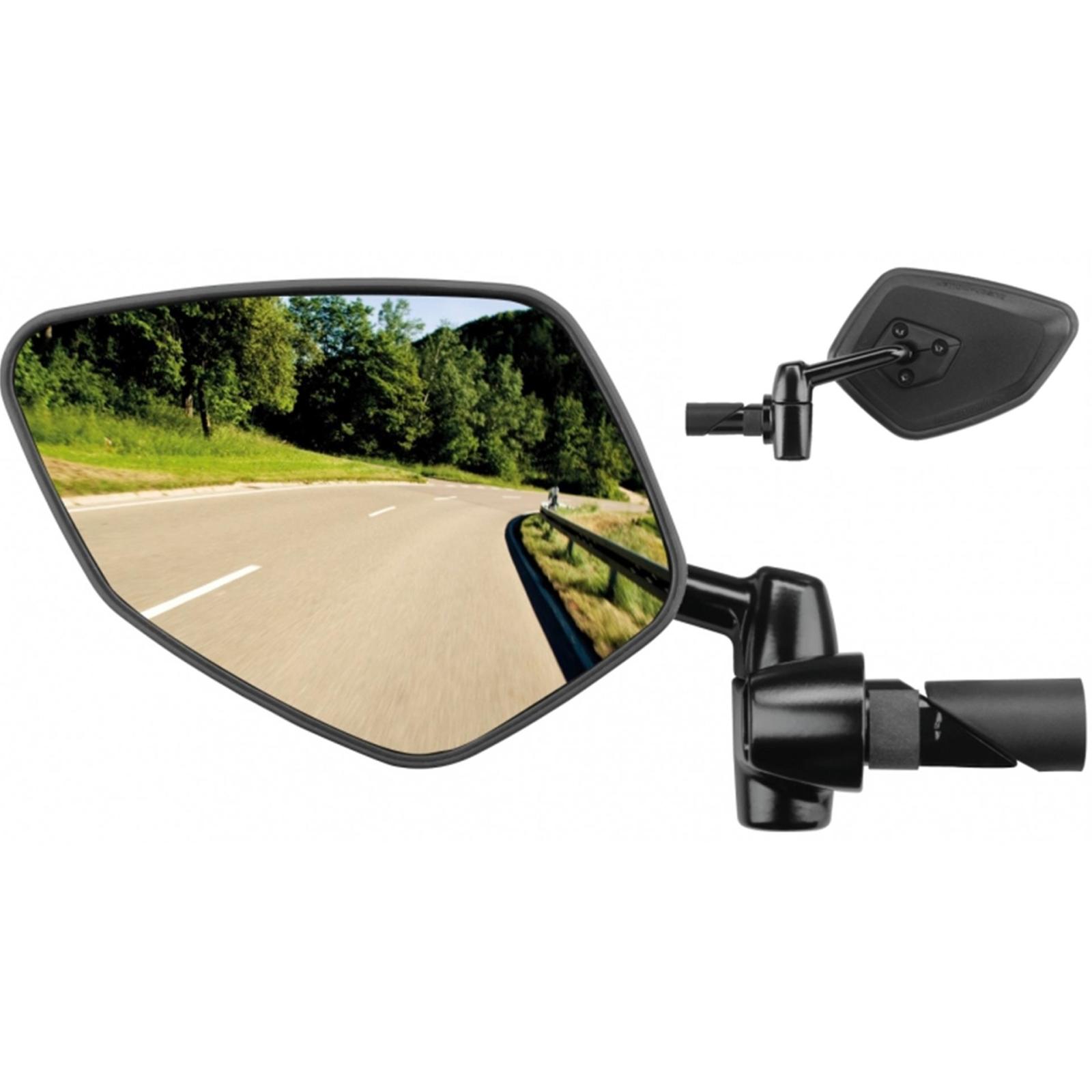 Die neue fünfeckige Spiegelform in der CYCLESTAR-Serie hat eine insgesamt noch größere Spiegelfläche. Die Weichkomponente, die den Spiegelkopf einrahmt, schützt bei Kollisionen. Diese Spiegel sind ausdrücklich für schnelle E-Bikes zugelassen, aber auch für alle Fahrräder geeignet. Kann einfach nach innen weggeklappt werden.