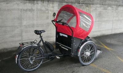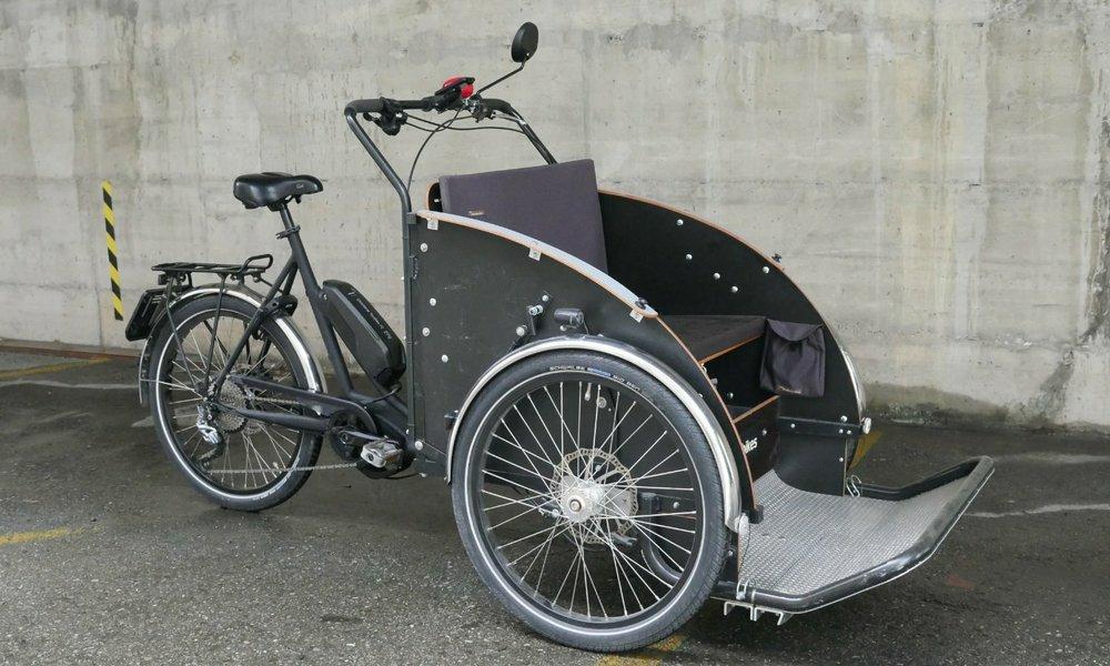 Wir haben die Rikscha von unserer ebenso langjährigen wie geschichtsträchtigen Transportvelo-Manufaktur Christiania in Dänemark soweit modifiziert, dass sie nun auch in der Schweiz für den Transport von zwei erwachsenen Personen zugelassen werden konnte. Dafür brauchte sie bessere Bremsen, eine Standbremse, bessere Bereifung und ausführliche Tests.