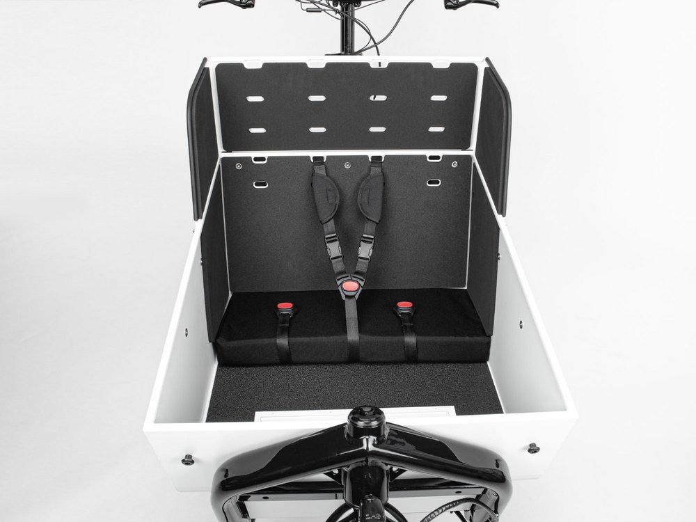 Die EVO Box Kids ist konzipiert für den sicheren Transport von ein oder zwei Kindern plus Einkauf und sonstigem Transportgut. Die Sitz-, Rücken- und Seitenpolster sind herausnehmbar und die Box damit ruck-zuck in eine reine Cargobox und wieder zurück zum komfortablen Kindertransporter umgebaut. Die Fussraumvertiefung und die Antirutschbeschichtung machen es den Kindern sicherer und bequemer und sorgen für eine Stauraumvergrösserung.