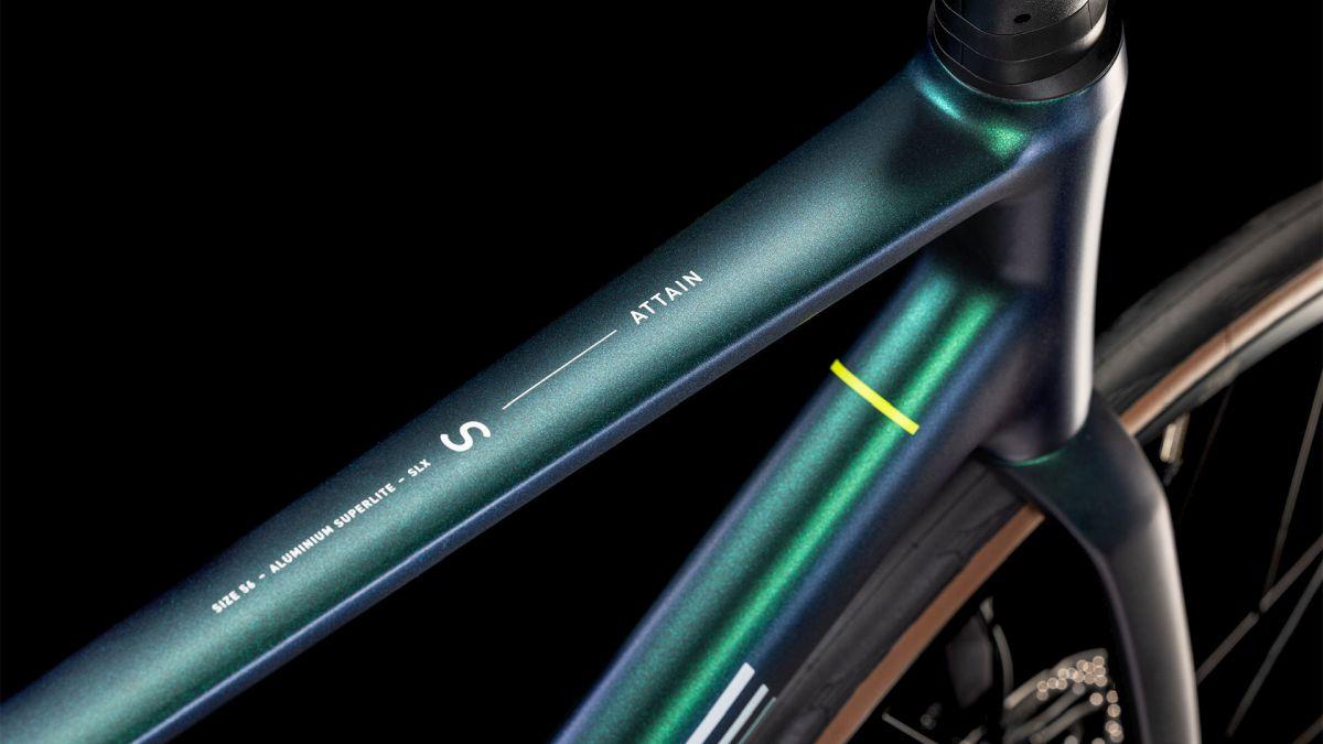 Bei der Entwicklung des semi-aerodynamischen Attain Rahmens aus 6061er-Aluminium haben wir viel Wert auf Performance bei zugleich hohem Komfort gelegt. Dank einem tränenformigen Unterrohr schneidet er pfeilschnell durch die Luft, außerdem sorgt die interne Zugverlegung für eine aufgeräumte Optik und wenig Wartungsaufwand. Apropos Optik: Die glatten, im Smooth Welding Verfahren gestalteten Rohrverbindungen verleihen dem Chassis seinen hochwertigen, überaus eleganten Look. Für das superpräzise Lenkverhalten und die direkte Kraftübertragung sind das konische Steuerrohr und Steckachsen vorne und hinten verantwortlich. Schlanke Sitzstreben und die Vollcarbongabel absorbieren etwaige Schläge und Vibrationen von der Straße und optimieren so den Fahrkomfort. Genügend Reifenfreiheit erlaubt die Montage von bis zu 32 mm breiten Pneus, dazu gibt's eine sauber integrierte Sattelklemmung sowie Aufnahmepunkte unter dem Oberrohr. Also alles da, was es für genialen Fahrspaß braucht – aufsitzen, antreten, genießen!