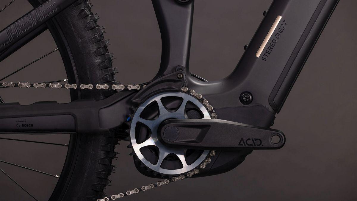 Der Rahmen des Stereo Hybrid ONE77 HPC ist wahrlich eine Klasse für sich, denn hier treffen 170 mm Federweg an der Front und am Heck auf ein Mullet-Set-up mit einem 29 Zoll Vorderrad und 27.5 Zoll Hinterrad. Damit werden Big-Mountain-Trail-Träume wahr! Wie immer bei CUBE maximal detailverliebt konstruiert auch der Rest: Integrated Cable Routing sorgt für einen supercleanen Look. Dazu kommt ein Steuersatz zur Winkelverstellung, mit dem sich das Handling an individuelle Vorlieben und Anforderungen anpassen lässt. Außerdem haben wir den 800 Wh starken PowerTube Akku gleich über dem Bosch CX Motor sauber und formschön ins Carbon-Unterrohr integriert. Für einfachere Ersatzteilverfügbarkeit gibt's ein UDH am Aluminium-Hinterbau – und weil wir auch eine Direct Mount Kettenführung verbaut haben, geht's mit diesem Fully selbst bei schwierigen Bedingungen weiter, weiter und immer weiter.