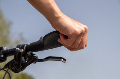 Die äussere Klemme ist vollständig verdeckt und in den in den Griff integriert. Die Einstellschraube für die Klemme befindet sich auf der Unterseite, so dass der gesamte Griff gummiert ist und in vielen Positionen gegriffen werden kann