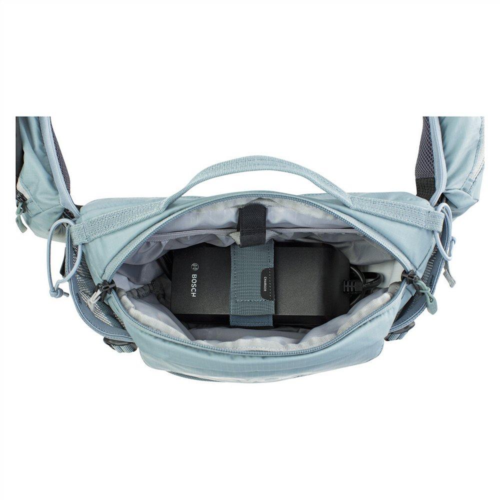 Belüftete Hüfttragetasche für E-Mountainbike-Touren mit Fächern für Ladegerät, Werkzeug, Kontroll-Display und einer Trinkblase sowie zwei Flaschenhalterungen.