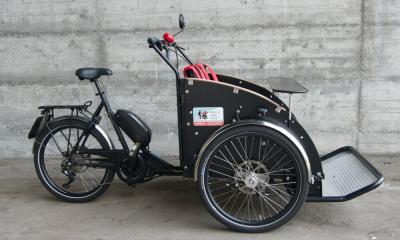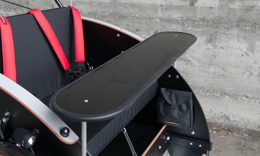 Nachdem die Passagiere in dem CHRISTIANIA Taxi-Bike Platz genommen haben, kann dieser Kaffee-Tisch quer verlaufend vor den Passagieren eingesteckt werden. Zwei stabförmige Stützen finden in den links und rechts angebrachten Halterungen an den Seitenflächen der Holzbox Platz. Die Passagiere können dann ihre Hände darauf ablegen oder z.B. Kaffee- oder Eisbecher darauf abstellen.