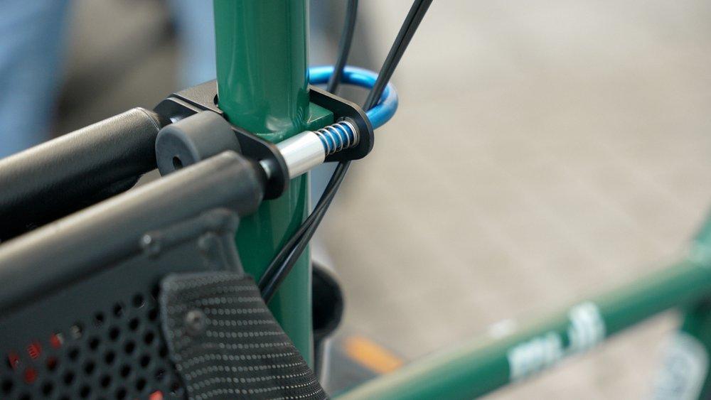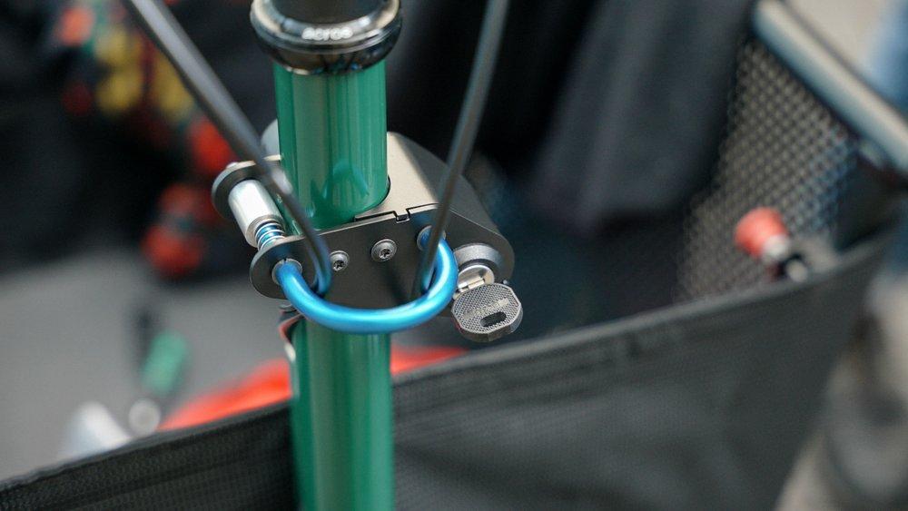 Das praktische Korbschloss wird am blauen Bügel, welcher den zusammengeklappten Korb arretiert, fest integriert. Der muli Korb ist dadurch abschliessbar und grössere Gegenstände sind sicher verstaut. Nachgerüstet werden kann dieses neue Feature an allen muli Modellen.