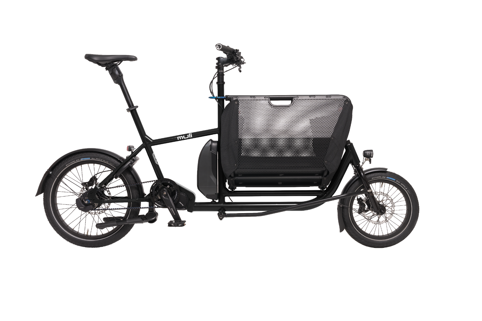 Trotz seiner kompakten Masse bietet es Platz für einen Kindersitz für zwei. Mit Blick nach vorne und Wind in den Haaren. Und wenn es mal bergauf geht oder die Woche lang war, gibt es das Muli auch mit E-Unterstützung.