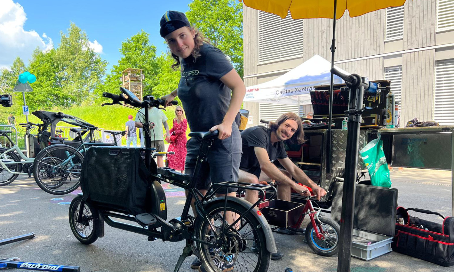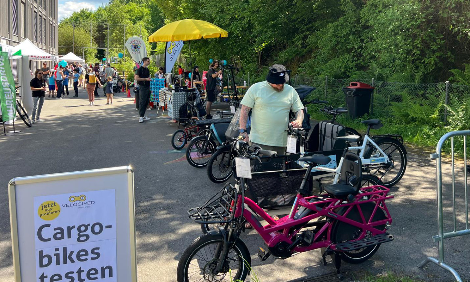 "Am besten selber testen": Wir haben eine kleine Cargobike-Roadshow zusammegestellt und sind damit an verschiedenen Anlässen unterwegs. So sollen möglichste viele Interessierte Möglichkeit haben, ein Cargobike unverbindlich auszuprobieren.