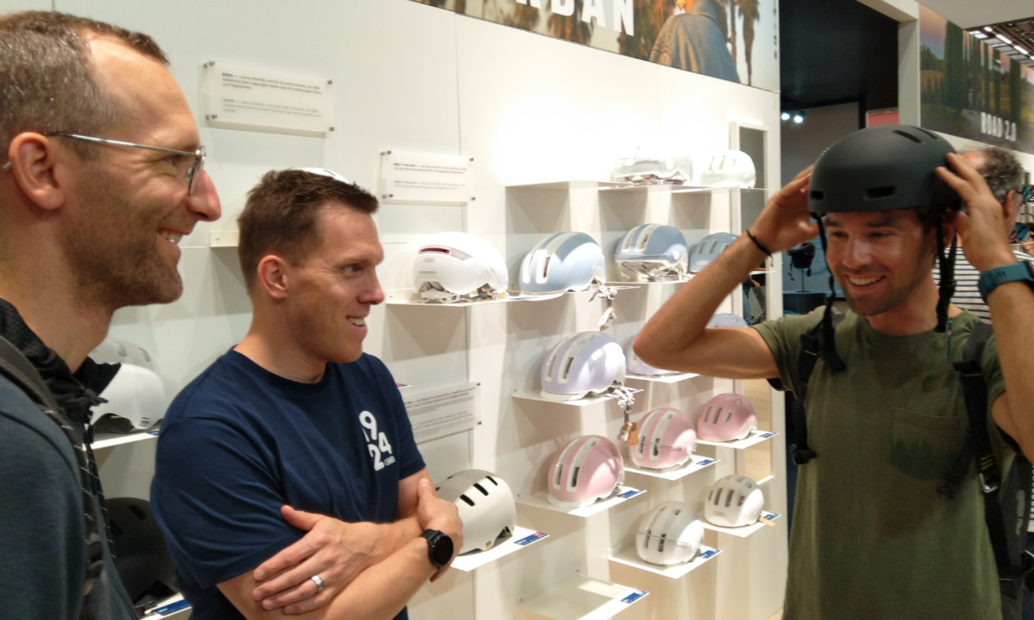 Michel testet bei Abus die Passform des neuen Stadt-Helms.