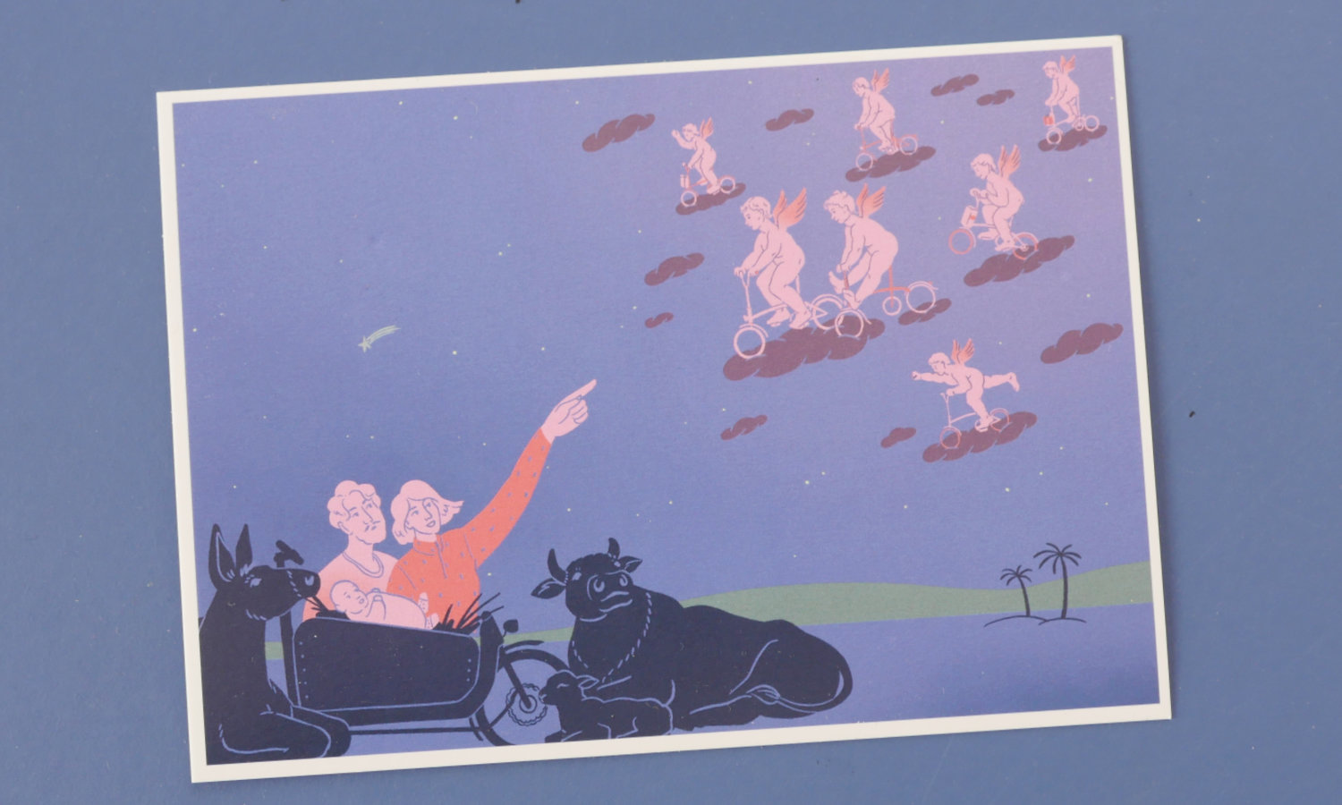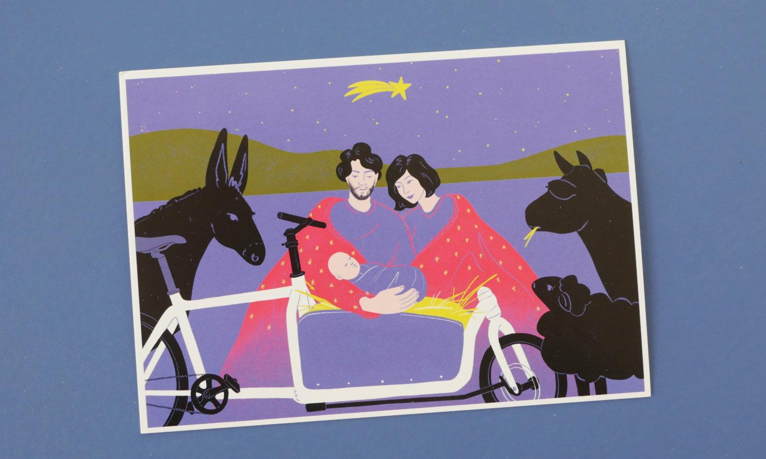 Gestaltet wurde die Karte auch dieses Jahr wieder von der Luzerner Illustratorin Lena Waldispühl. Sie hat uns bereits letztes und vorletztes Jahr mit einer schönen Postkarte beglückt: Nachdem im ersten Jahr Maria und Josef im Bullitt ihre Krippe errichteten, kamen letztes Jahr die Engelchen auf ihren Brompton-Falträder herbeigeflitzt. Dieses Jahr kommen nun die munteren Hirtenkindchen auf ihren Kindervelos zur Krippe. Für Sammler:innen haben wir auch von den älteren Karten noch einige da.