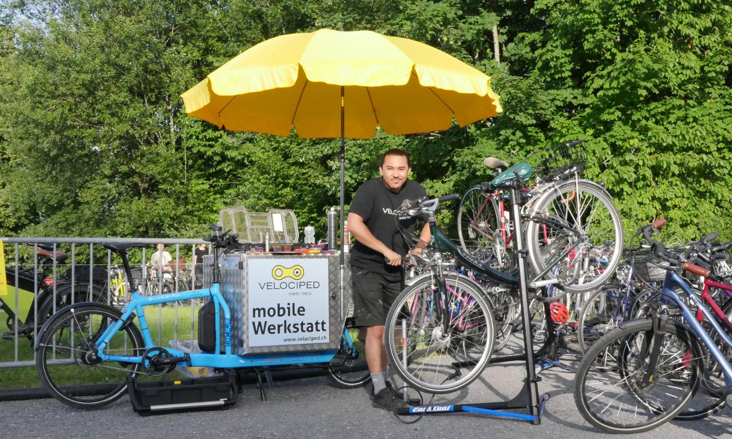 Das B-Sides-Festival lockte Mitte Juni während den drei Festival-Tagen viele Besucher:innen auf den Sonnenberg. Auto-Parkplätze werden da bewusst nicht angeboten, wer ans Fest will, nimmt die Sonnenbergbahn, geht zu Fuss oder per Velo. Als kleines Geschenk für alle, welche den Weg und die Höhenmeter per Pedal auf sich genommen haben, waren wir mit unserer mobilen Werkstatt vor Ort und haben Bremsen nachgezogen, Schaltungen eingestellt, Schutzbleche befestigt, gepumpt, Ketten geölt ... was gerade so anfiel, damit alle wieder sicher ins Tal kamen. Unser Service war für die Festival-Besucher:innen kostenlos, was wir als "B-Sides Super-Firmen-Lovers" sehr gerne gemacht haben. Am Freitag waren wir zu zweit vor Ort, am Samstag zur dritt und haben an den beiden Tagen ca. 100 Velos wieder flott gemacht. Oder zumindest ein bisschen flotter.Ein solch schöner Arbeitsplatz haben wir selten, so sind wir nächstes Jahr wieder dabei.