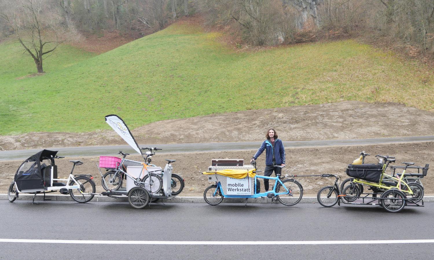 ... der ganze Stuff (mobile Werkstatt und Cargobike Roadshow) finder auf zwei Cargos mit Anhänger platz.