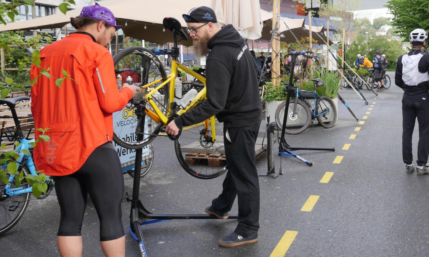 Bevor die Teilnehmenden auf die über 300 km lange Strecke starteten, trimmte Christian noch ein paar Schaltungen, pumpte paar Pneus und schmierte Ketten. Was alles so mit unserer mobilen Werkstatt möglich ist.