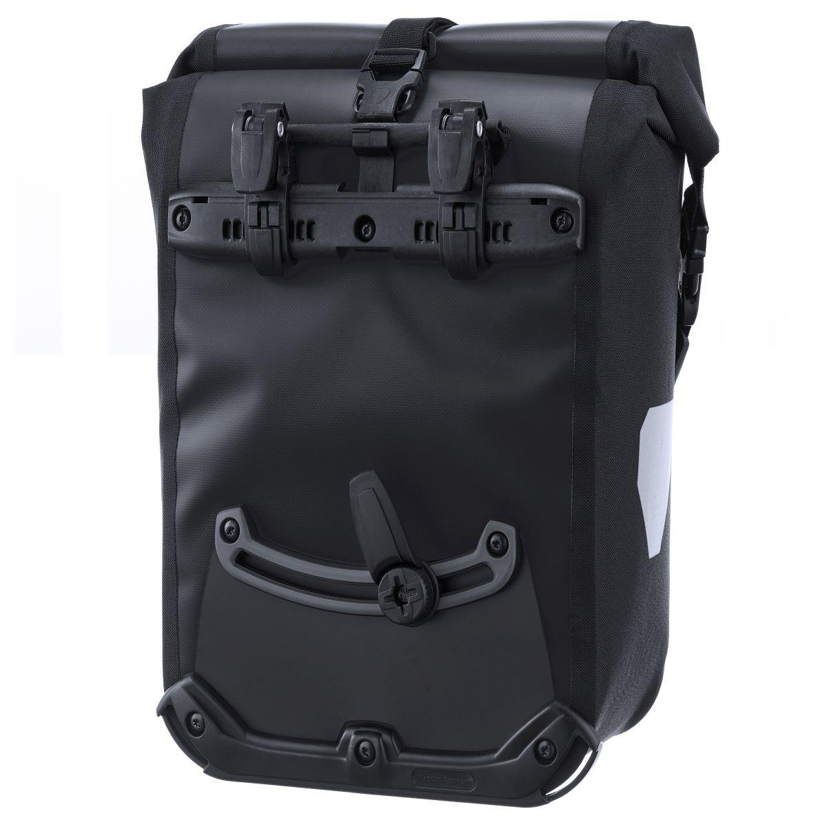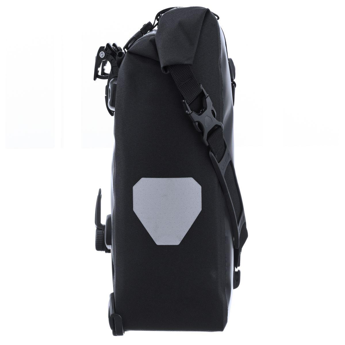 Universelle Packtasche (Paar) mit Rollverschluss für Lowrider und Hinterradgepäckträger (z. B. für Kinderräder); Quick-Lock2.1 System bis 16 mm Gepäckträgerrohr; PU-beschichtetes Polyestergewebe; inkl. Innentasche; großflächige Reflektoren; Tragegurt; Kombinationsmöglichkeit mit Rack-Pack 24 L und 31 L auf dem Hinterradgepäckträger.