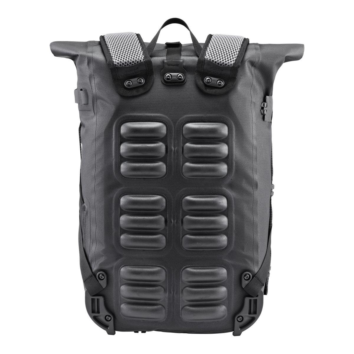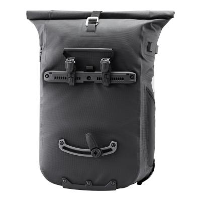 Rucksack mit Rollverschluss und Quick-Lock Aufhängesystem; Einsatz als Radtasche oder Rucksack; PU-beschichtetes Gewebe mit eingearbeitetem Reflexgarn; schneller, intuitiver Wechsel zwischen den Funktionen mittels wendbarer Fronttasche; Außentasche in Flap integriert (nicht wasserdicht!); seitliche Netzaußentasche; Innentasche mit Laptopfach; Tragegriff; Brustgurt; Reflektoren; Quick-Lock2.1 System bis 16 mm Gepäckträgerrohr