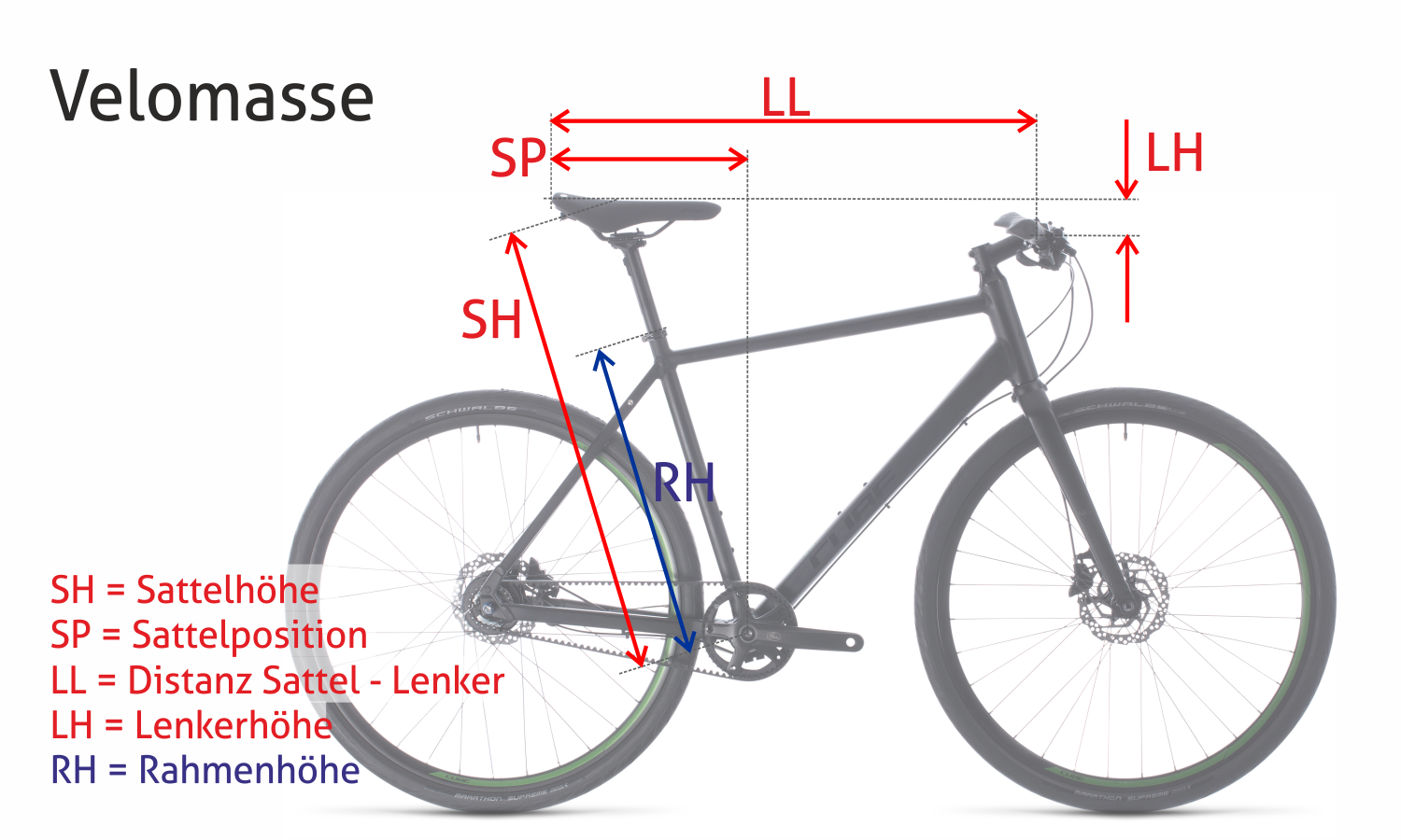 Anhand der Schrittlänge können wir den Sattel auf die korrekte Höhe stellen. Zudem gibt sie gute Hinweise auf die richtige Rahmengrösse. Hast du ein Velo, auf welchem es dir sehr wohl ist? Die Masse der zweiten Skizze helfen uns als Referenzwerte beim Finden der richtigen Rahmengrösse und beim Einstellen des Velos.
