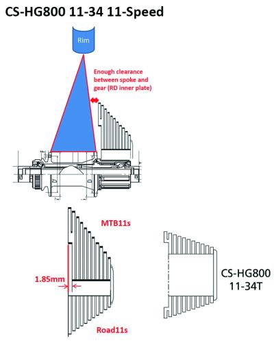 Durch die MTB Bauweise kann die CS-HG800-11 mit der 11-34 Abstufung auch auf einen Road 10-Fach Body montiert werden. Zur Montage auf einen aktuellen 11-Fach Body ist ein 1,85mm Spacer beigelegt