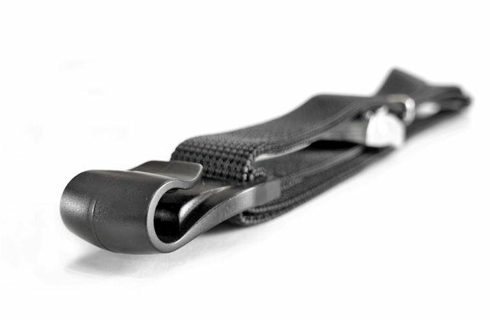 Hochwertiger Spanngurt aus stabilem 25mm-Gurt mit ARNO-Klemmschliesse und zwei an den Enden eingenähten Kunststoffhaken, die genau zu den gefrästen Öffnungen des Aluchassis passen. So werden die Spanngurte einfach und schnell eingeklickt, statt wie bei herkömmlichen Spanngurten mühsam durchgefädelt werden zu müssen.