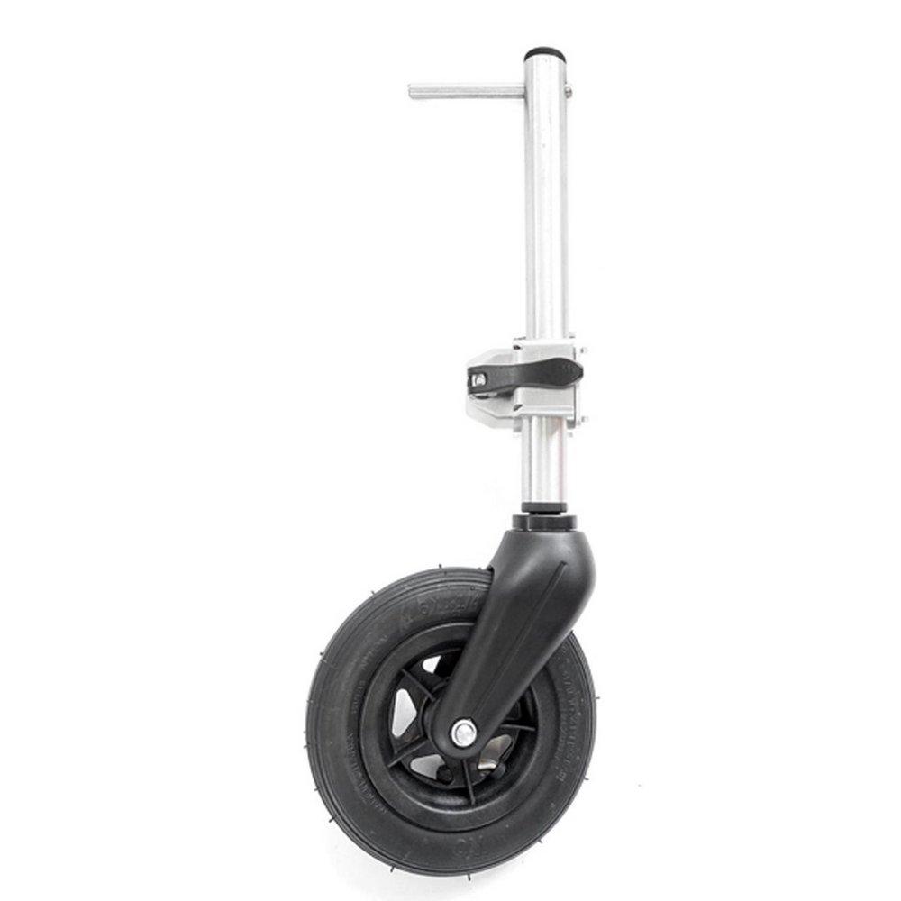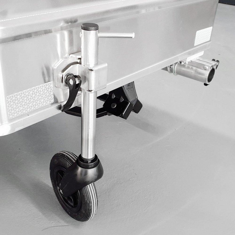 Das Stützrad ermöglicht das kinderleichte Manövrieren auch schwerer Anhänger auf engstem Raum ohne Krafteinsatz. Es wird vorne möglichst mittig montiert und lässt sich dank eines Schnellspannhebels mühelos absenken, hochstellen oder auch komplett aus der Halterung herausnehmen. Im Gegensatz zu handelsüblichen Rohrklemmschellen können die von HINTERHER hohe Haltekräfte erzeugen, die auch den Einsatz als Arbeitstisch o.ä. erlauben.
